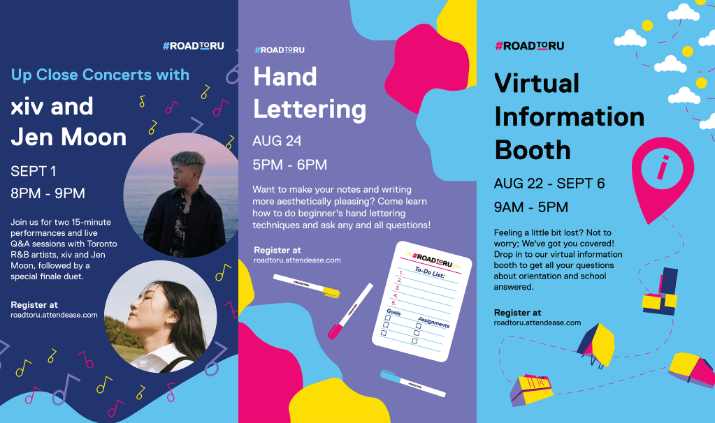 For Ryerson University’s central orientation, I created the branding, including establishing a colour palette and making branding assets, which I used to design event posters, Instagram stories, posts and campus decals.