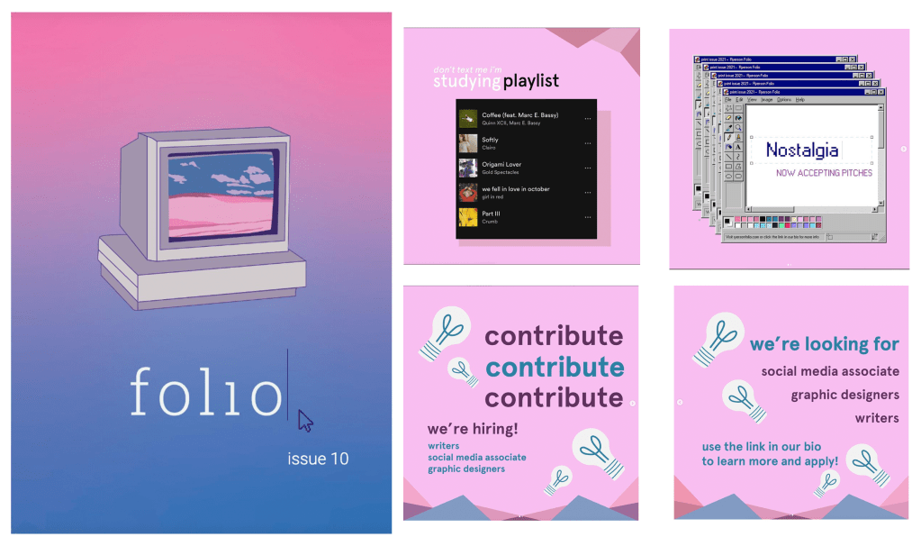I worked as a graphic designer where I had the opportunity to put together the orientation branding for Ryerson University, as well as create graphics for the 2021-22 school year.